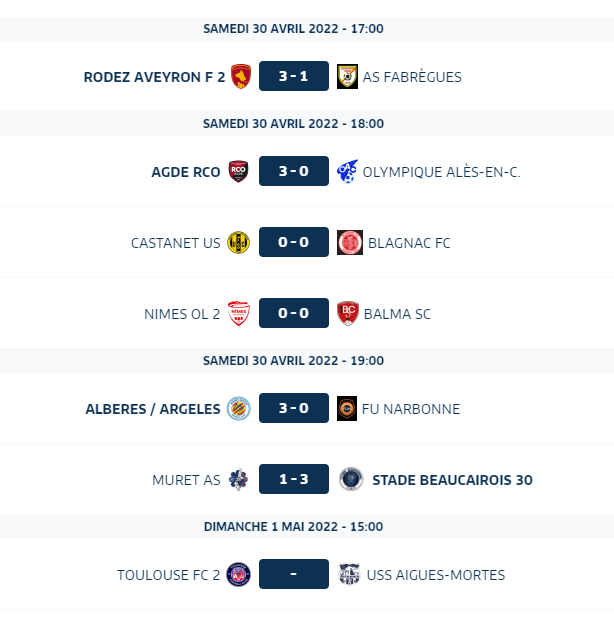 Stade : Clément-Ader. Mi-temps : 0-1. Arbitre : M. Lapalu. But pour Muret : Sow (86e). Buts pour Beaucaire : Konan (19e), Daoudi (64e et 84e).