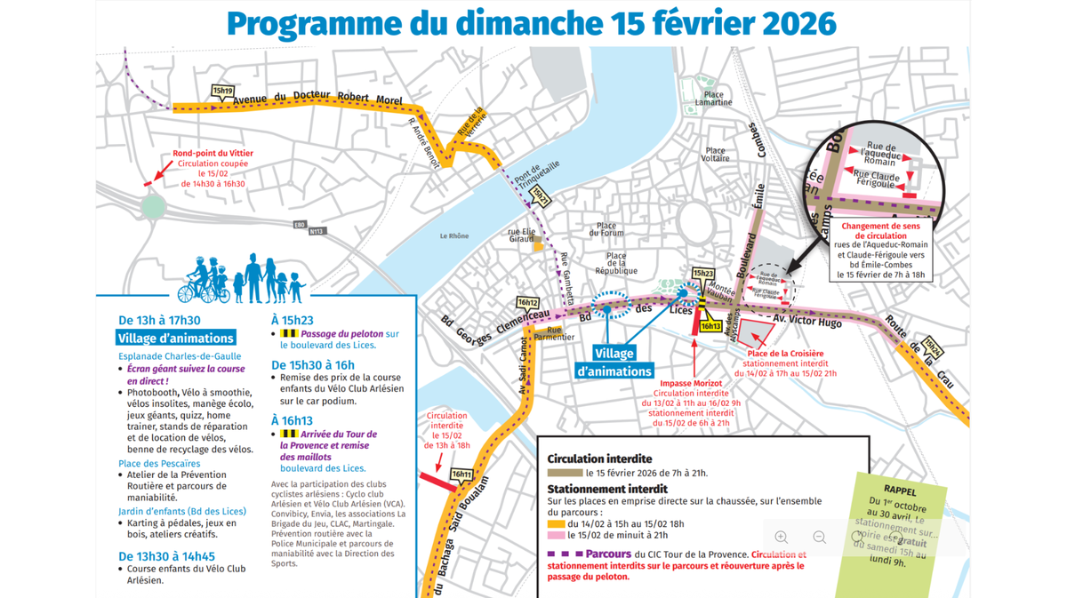 Dimanche 15 février 2026, au terme de l’étape partie à 11h30 de Rognac, le peloton franchira la ligne d'arrivée sur le boulevard des Lices vers 16h20. Les coureurs auront parcouru les 40 derniers kilomètres de l’ultime étape sur le territoire arlésien.