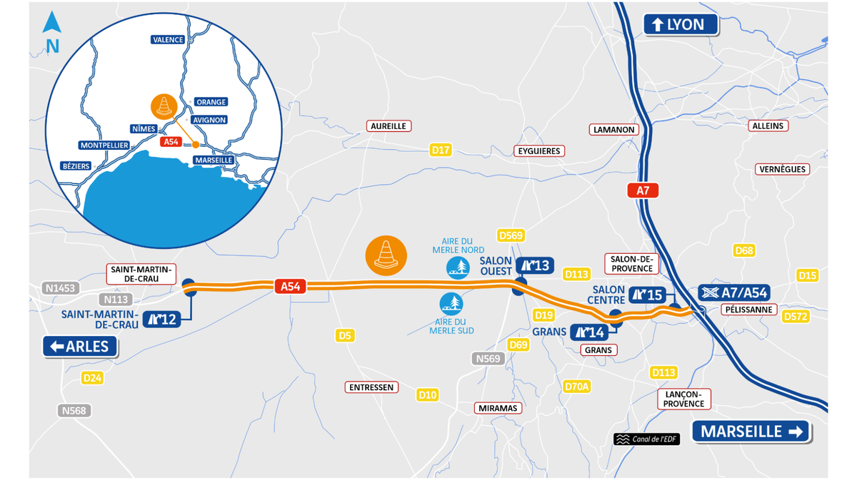 Les nuits du lundi 13 au mercredi 15 octobre, plusieurs bretelles seront fermées, notamment à la bifurcation A7/A54 et aux échangeurs de Grans-Salon-de-Provence (n°14), Salon-centre (n°15) et Eyguieres-Miramas (n°13). Des déviations locales seront mises en place via Rognac, Salon-de-Provence et Coudoux-La Fare. La nuit du jeudi 16 octobre, la fermeture concernera cette fois la section de l’A54 au niveau de l’échangeur de Grans, avec sortie obligatoire pour les véhicules venant de Lyon ou Marseille.