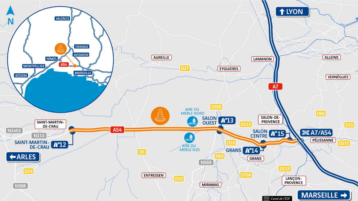 Pour limiter la gêne aux usagers, les travaux se déroulent exclusivement de nuit, du lundi au vendredi. Toutefois, la progression du chantier nécessitera la fermeture complète de l’A54 entre les échangeurs de Grans (n°14) et Eyguières-Miramas (n°13) durant les nuits du lundi 27 au jeudi 30 octobre, de 21h à 6h.