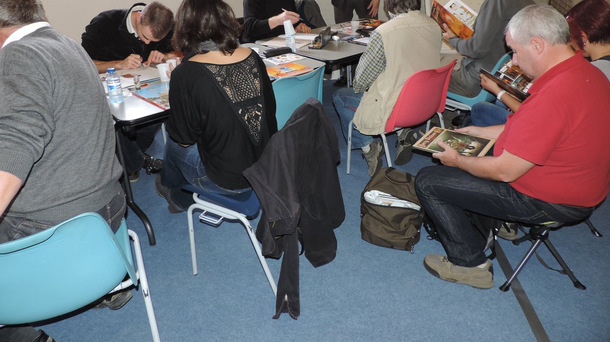 Dans un festival de BD, on reconnait les passionnés à leur tabouret (pour faire la queue devant les auteurs), leur cartable résistant à l'eau (pour transporter les BD à dédicacer) et leur incroyable patience. Ces deux la sont venus l'un de Manosque et l'autre de Bézier pour voir Reno et rien que lui (voir ici la liste des auteurs présents). Ils discutent depuis les début de la matinée en attendant l'auteur qui n'arrivera que dans l'après-midi. "On se connait tous" expliquent-ils et "on se retrouve de salon en salon. Bien sur nos livres prennent de la valeur une fois qu'ils sont dédicacés par l'auteur, mais c'est surtout une valeur sentimentale. Peu de ces ouvrages dédicacés sont revendus, chacun préfère les conserver. D'ailleurs si vous comptez les kilomètres parcourus et parfois les frais d'hôtel, c'est une activité qui ne serait même pas rentable..."