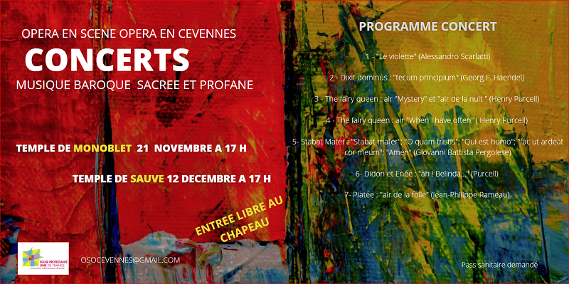 L’Eglise Protestant Unie de France vous propose un Concert de musique baroque sacrée et profane par le groupe Opéra en Scène Opéra en Cévennes.