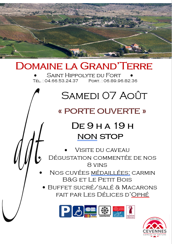 Au programme : • Visite du caveau • Dégustation commentée de nos 8 vins • Nos cuvées médaillées : carmin B&G et Le Petit Bois • Buffet sucré/salé & Macarons fait par Les Délices d’Ophé Contact : Domaine de la Grand’Terre – 48 Fg de Mandiargues 30170 St Hippolyte du Fort – Tél. 04 66 53 24 37 ou 06 89 96 82 36