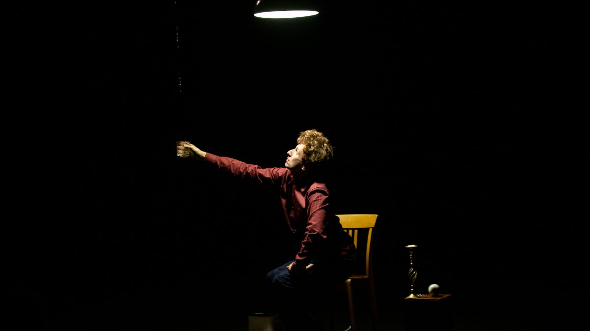 Sous une lampe suspendue, parfois récalcitrante, la balle blanche en mouvement devient le centre d’un univers réduit à l’essentiel. Une chaise, un chandelier, quelques allumettes, un tas ! Une enceinte grésillante diffuse du vieux tango. Rousselet joue avec les défaillances de la lumière et de la durée du noir. C’est « Fra » qui est aux manettes, derrière le rideau…