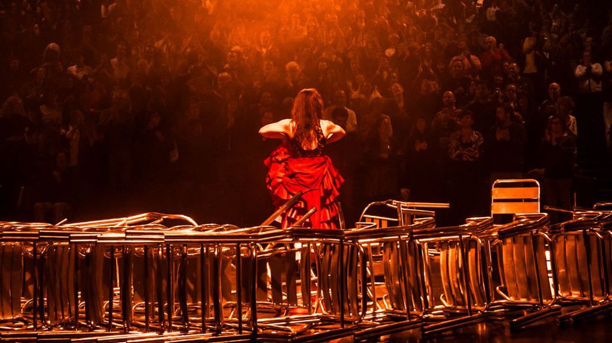 Ici pas de guitare, mais une batterie qu’elle chevauche elle-même. La suite dévoile un espace plus onirique et plus fou. Molina glisse vers la danse plus classique et aussi vers une écriture scénique nourrie de silence, de voix parlée, de chant et de batterie. Autour d’elle, un dispositif de chaises empilées. Une colonne de verre abrite quatre cantaoras incroyables (Ana Polanco, Ana Salazar, María del Tango et Gara Hernández), et explose régulièrement en couleurs et en son, jusqu’à la rave-party.
