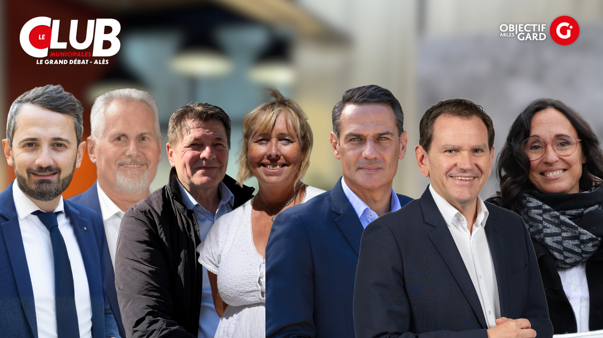 En plateau : Paulette Gougeon, maire de Lunel, Stéphane Dalle, candidat de la liste « Lunel au cœur », Lise Florès, candidate de la liste « Lunel Collectif - Gauche et écologies citoyennes », Bruno Gagne, candidat de la liste « Pour l’Union populaire - Lunel fière et solidaire », Anthony Belin, candidat de la liste « Lunel, c’est vous ! », Thierry Razigade, candidat de la liste « Vivons Lunel », et Stéphane Muscat, candidat de la liste « Envie de Lunel ».