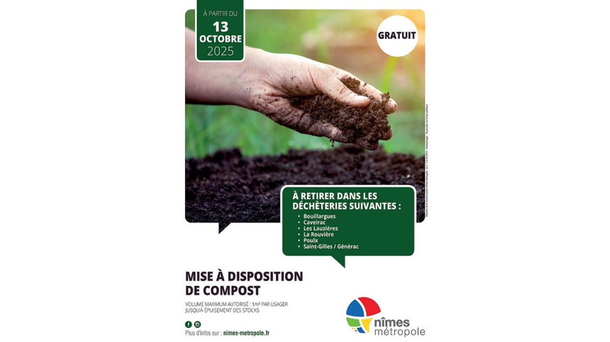 Dans le cadre de son projet « Territoire 100 % compostage », l’Agglomération organise une distribution gratuite de compost pour tous les habitants à partir du lundi 13 octobre 2025 dans six déchèteries du territoire : Bouillargues, Caveirac, les Lauzières, La Rouvière, Poulx, Saint-Gilles/Générac. Une belle occasion d’adopter le jardinage durable ! Et grâce à la présence exceptionnelle du « Camion des solutions » sur la déchèterie des Lauzières, profitez-en pour en découvrir davantage sur le réemploi !