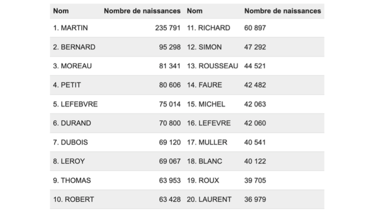 Cette carte interactive permet, en un coup d’œil, d’identifier les noms de famille qui dominent dans chaque département et de faire émerger de grands ensembles régionaux. Elle révèle notamment l’hégémonie du patronyme Martin, n°1 au niveau national, dans une trentaine de départements (en jaune), ainsi qu’une forte présence de Moreau dans les régions Centre et Nouvelle-Aquitaine. L’outil met également en évidence l’empreinte des noms issus du métier de forgeron (en vert) – Lefebvre, Lefèvre, Faure, Fabre, Favre, Schmitt… – dont la répartition varie selon les aires linguistiques, ou encore la prédominance de patronymes d’origine espagnole (Garcia, Martinez, Lopez, Sanchez, Perez…) dans certains départements du pourtour méditerranéen, héritage des migrations des XIXᵉ et XXᵉ siècles. Autant d’illustrations concrètes de la manière dont l’histoire, les langues régionales et les mouvements de population ont façonné l’identité des familles françaises.