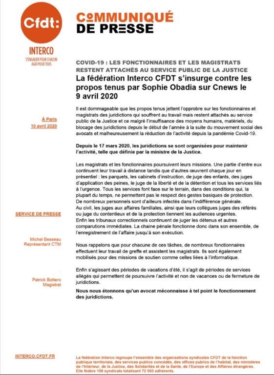 Voici le communiqué de presse du syndicat CFDT Interco suite aux propos d'un avocat sur un plateau télé: