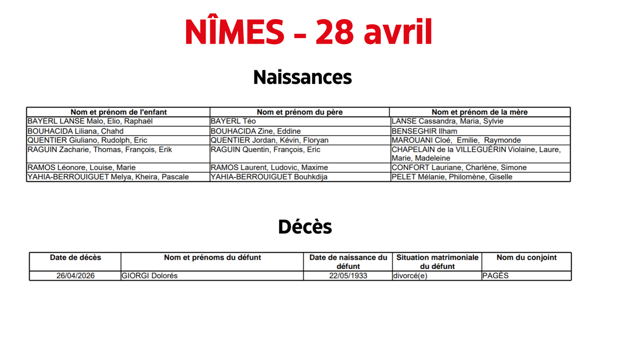 Nîmes : Naissances décès du 28 avril