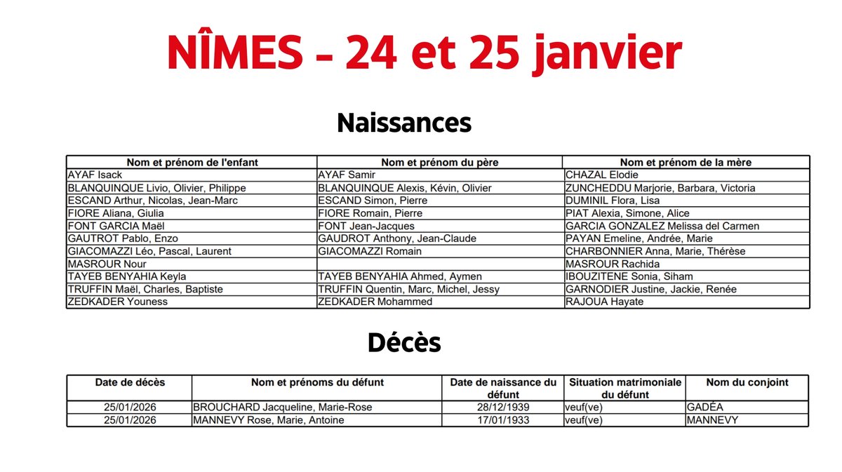 Nîmes : Naissances et décès du 24 au 25 janvier