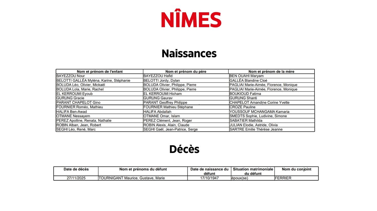 Nîmes : Naissances et décès du 27 au 29 novembre