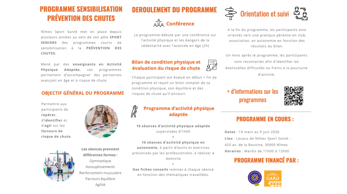 Les programmes « Prévention des chutes » sont encadrés par des enseignants en Activité physique adaptée (APA). Ils permettent aux participants d’identifier et de réduire les facteurs de risque de chute grâce à un suivi structuré et sécurisé.