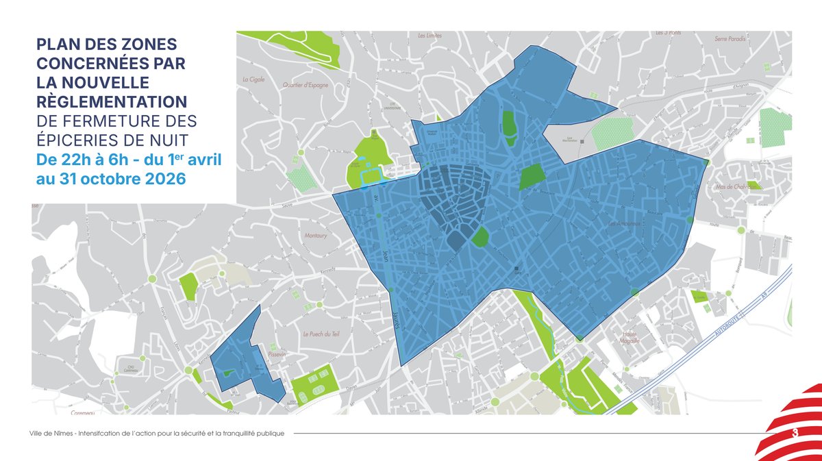 En janvier, l'ex maire de Nîmes Jean-Paul Fournier avait annoncé la mise en place d'un arrêté municipal pour encadrer les horaires des épiceries de nuit dans un périmètre ciblé de la ville du 1er avril au 31 octobre 2026. Ils devront fermer leurs portes entre 22h et 6h du matin. Afin de garantir la tranquillité publique et la sécurité des habitants, son successeur Vincent Bouget a décidé de maintenir cet arrêté et de le mettre en oeuvre.