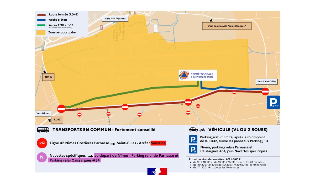 - privilégier les navettes depuis les parkings-relais mis en place: La navette se situe au Parnasse, à Nimes. Elle fait également une halte au niveau du parking relai de la sortie A54-Nimes Centre. Prix du billet pour la navette: 3,60 euros aller-retour.