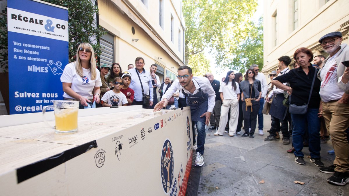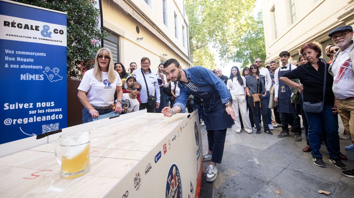 En fin d’après-midi, l'établissement du Verre des Costières a vu défiler plateaux, tasses et verres bien tenus, ou pas. La course de garçons et filles de café a animé l’esplanade dans une ambiance studieuse, mais festive. Par vagues de quatre, les concurrents se sont élancés du milieu de l'Esplanade, devant le Verre des Costières, direction rue Régale, retour au même endroit.