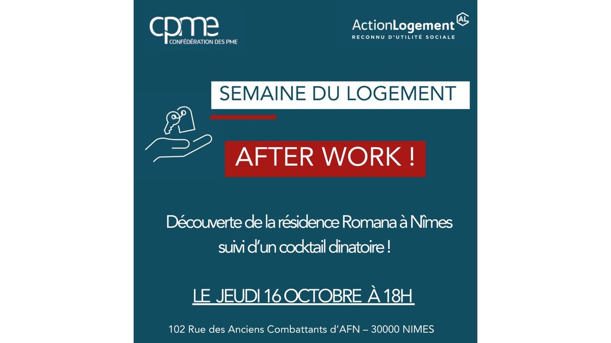 Dans le cadre de cette Semaine du logement, la CPME GARD vous invite à un after-work le jeudi 16 octobre 2025 à 18h. Cette rencontre débutera par une visite privilégiée de la résidence Romana à Nîmes (102 Rue des Anciens Combattants d’AFN – Nîmes), un programme qui illustre l’engagement d’Action Logement en faveur du logement temporaire et adapté pour les jeunes en formation, salariés modestes, travailleurs en insertion, saisonniers… afin de faciliter leur mobilité et leur parcours professionnel. Elle se poursuivra à la Brasserie des Costières où il y aura une présentation des services et dispositifs d’Action Logement, suivie d’un cocktail dînatoire convivial.