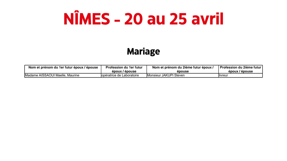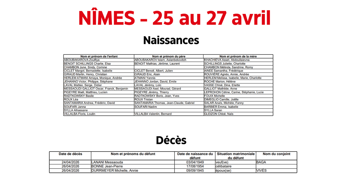 Nîmes : Naissances décès et mariage du 20 au 27 avril
