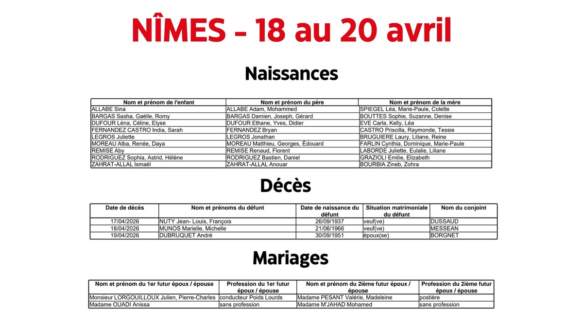Nîmes : Naissances et décès du 18 au 20 avril