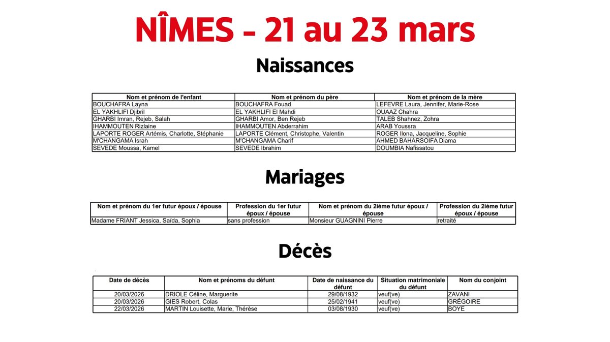 Nîmes : Naissances et décès du 21 au 23 mars