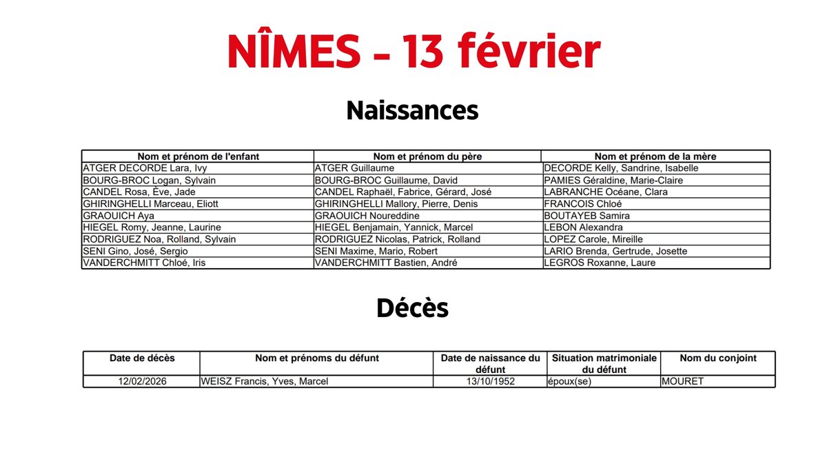 Nîmes : Naissances, décès du 13 février