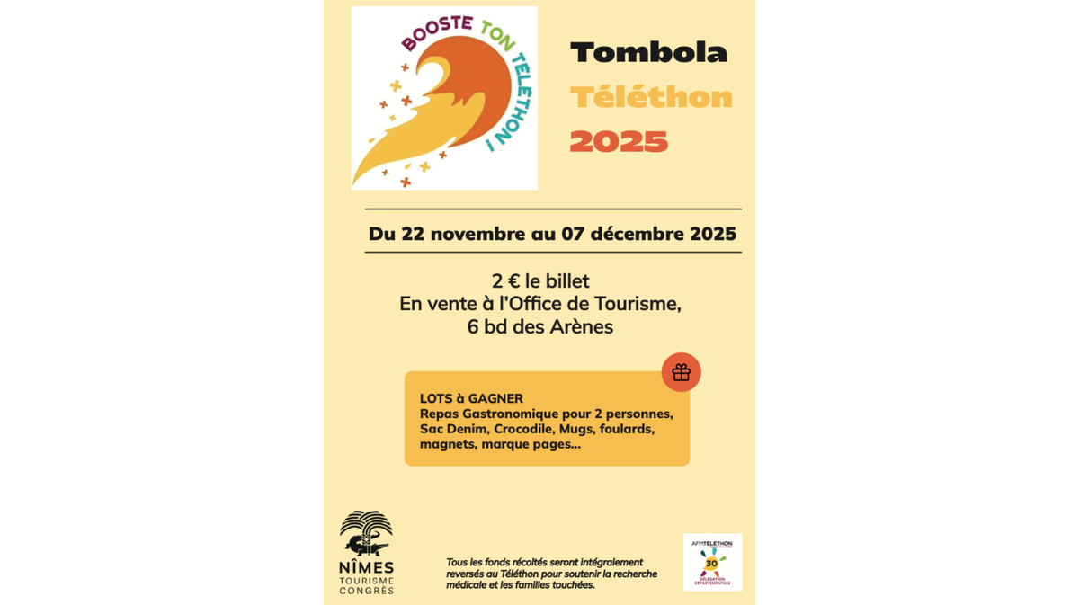 Les tickets sont disponibles à l’office de tourisme de Nîmes, situé au 6 boulevard des arènes, ouvert tous les jours de 9h à 18h. Les participants auront ainsi l’occasion de faire un geste solidaire tout en tentant leur chance de gagner de beaux cadeaux.