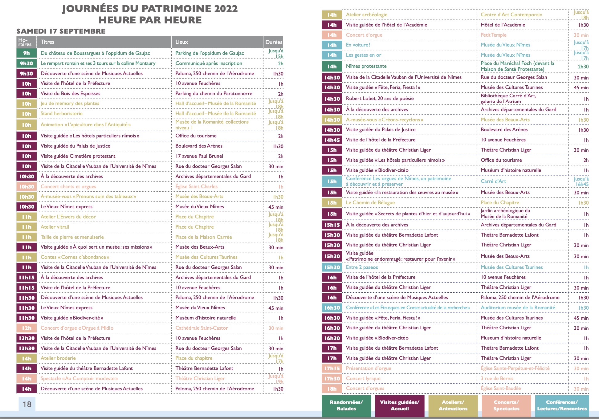 Patrimoine en musique : Concert lyrique, peintres en chansons, orgues nîmois, les orgues de Nîmes (un patrimoine à découvrir et à préserver), l'église saint-Charles (XVIIIe- XIXe), la cathédrale Notre Dame-et-Saint Castor (XIe –XVIIe), le Petit Temple (XVIIIe), l'église Sainte Perpétue-et-félicité (XIXe), l'église Saint-Baudile (XIXe), le Grand Temple (XVIIe), le Temple de l’Oratoire (XIXe) et l'église Saint-Paul (XIXe).
