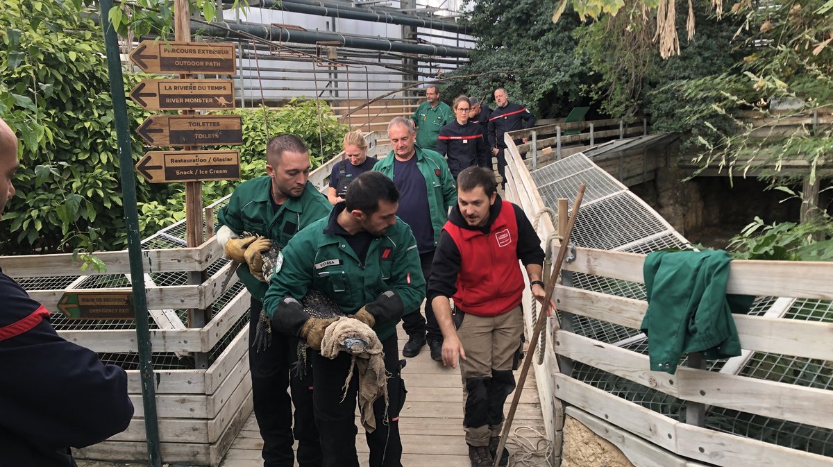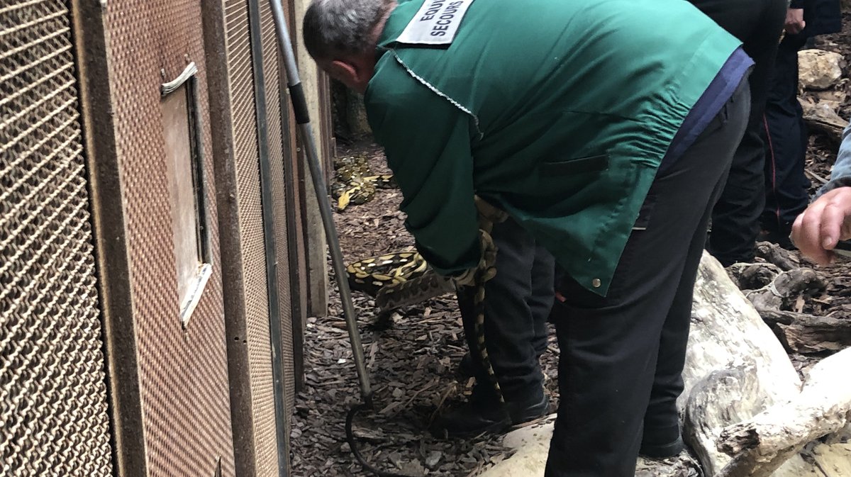 Dans un deuxième temps, direction l'enclos des serpents, dont les impressionnants pythons réticulés. Même méthodologie, Antoine explique méticuleusement chaque geste à adopter puis c'est autour des pompiers de s'y essayer. Pas évident avec des pythons de plusieurs mètres !