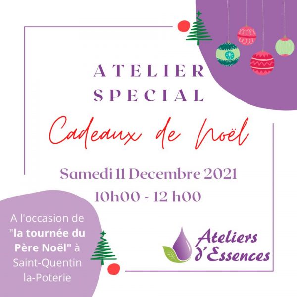 Dans le cadre de la Tournée du Père Noël organisé à St Quentin la Poterie, retrouvez cet atelier "cadeaux de Noël" faits maison, naturels et zéro déchet proposé par Atelier d'Essence et Le Tiers Lieu 21. Dans le cadre de l'ambiance festive de la "Tournée du Père Noël" à Saint-Quentin-la-Poterie, le week-end des 11 & 12 décembre, arrêtez-vous à la Maison Up Up Up, 1 place de la liberté, pour faire une pause créative et fabriquer vos propres cadeaux de Noël Bio & Zéro déchets !