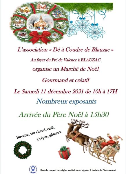 L'association Dé à coudre de Blauzac vous invite au marché de Noël gourmand et créatif regroupant les producteurs, artisans et commerçants locaux. profitez en pour faire vos cadeaux de Noël ! buvette et petite restauration sur place.