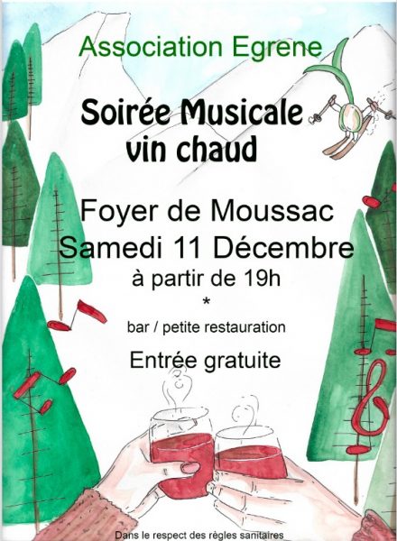 L'association Egrène vous invite à une soirée musicale - vin chaud au Foyer de Moussac. Bar et petite restauration sur place.