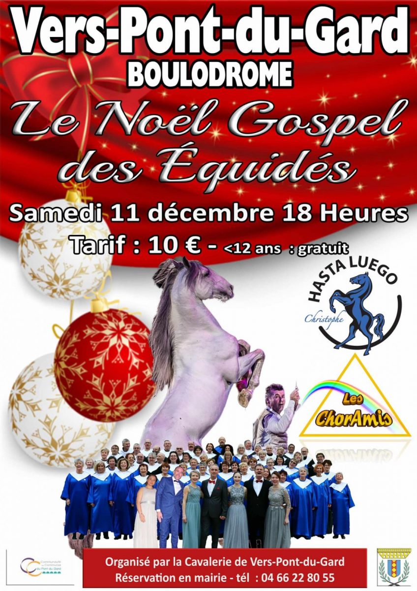 Grand spectacle équestre et musical de Noël : Du Gospel avec le groupe les CHOR'AMIS et Christophe HASTA LUEGO en vedette. Un show organisé par la Cavalerie de Vers-Pont-du-Gard en collaboration avec la Mairie et la Communauté de Communes du Pont du Gard.