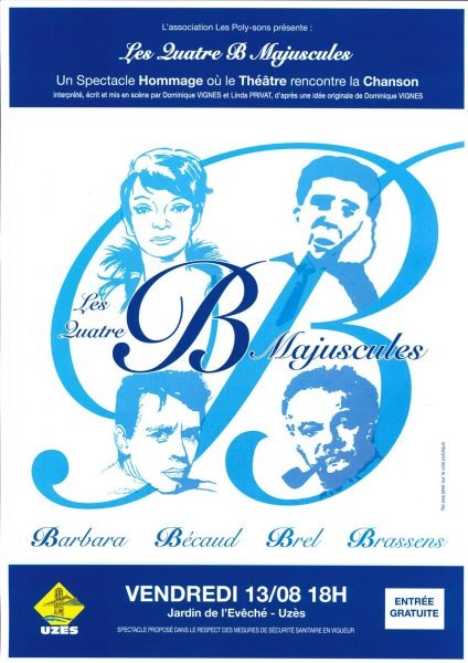 Les quatre B Majuscules vous propose un spectacle hommage où le théâtre rencontre la chanson. Hommage à Barbara, J. Brel, G. Brassens et Bécaud. Une rencontre chaleureuse entre chanson, théâtre, anecdotes, sourires et partage.
