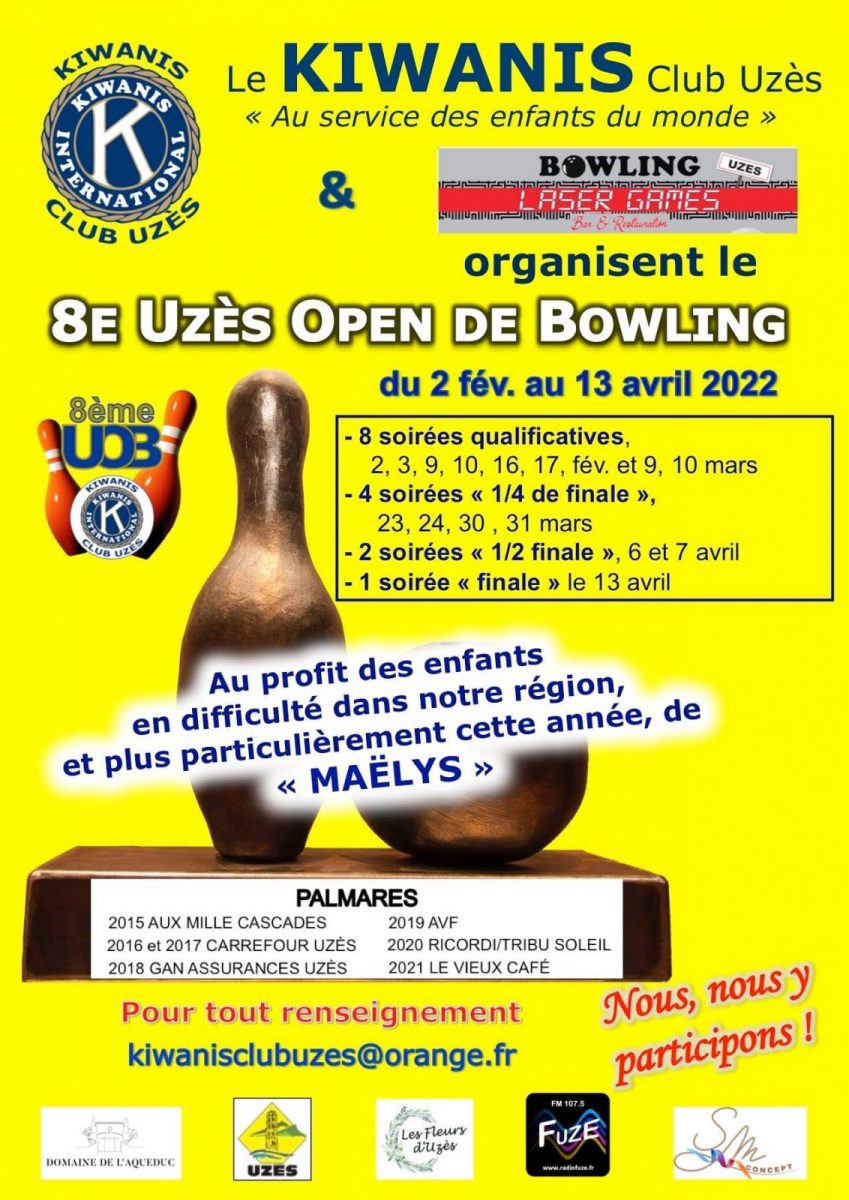 Le Kiwanis Club et le Bowling Laser Game propose le 8e uzès Open de Bowling. Au programme 8 soirées qualificatives, 4 soirée 1/4 de finale, 2 soirée 1/2 finale et une soirée finale. Soirée au profit des enfants en difficulté dans notre région, et plus particulièrement cette année, de "Maëlys".