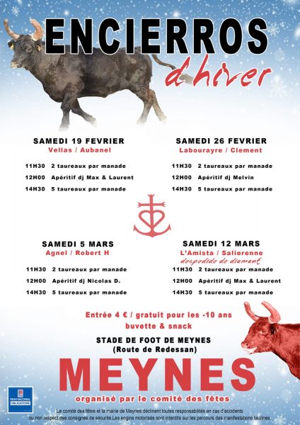 Le comité des fêtes de Meynes vous propose les Encierros d'hiver tous les samedis. Des manades différentes à chaque fois avec deux taureaux par manade à 11h30, un apéritif, puis 5 taureaux par manade.