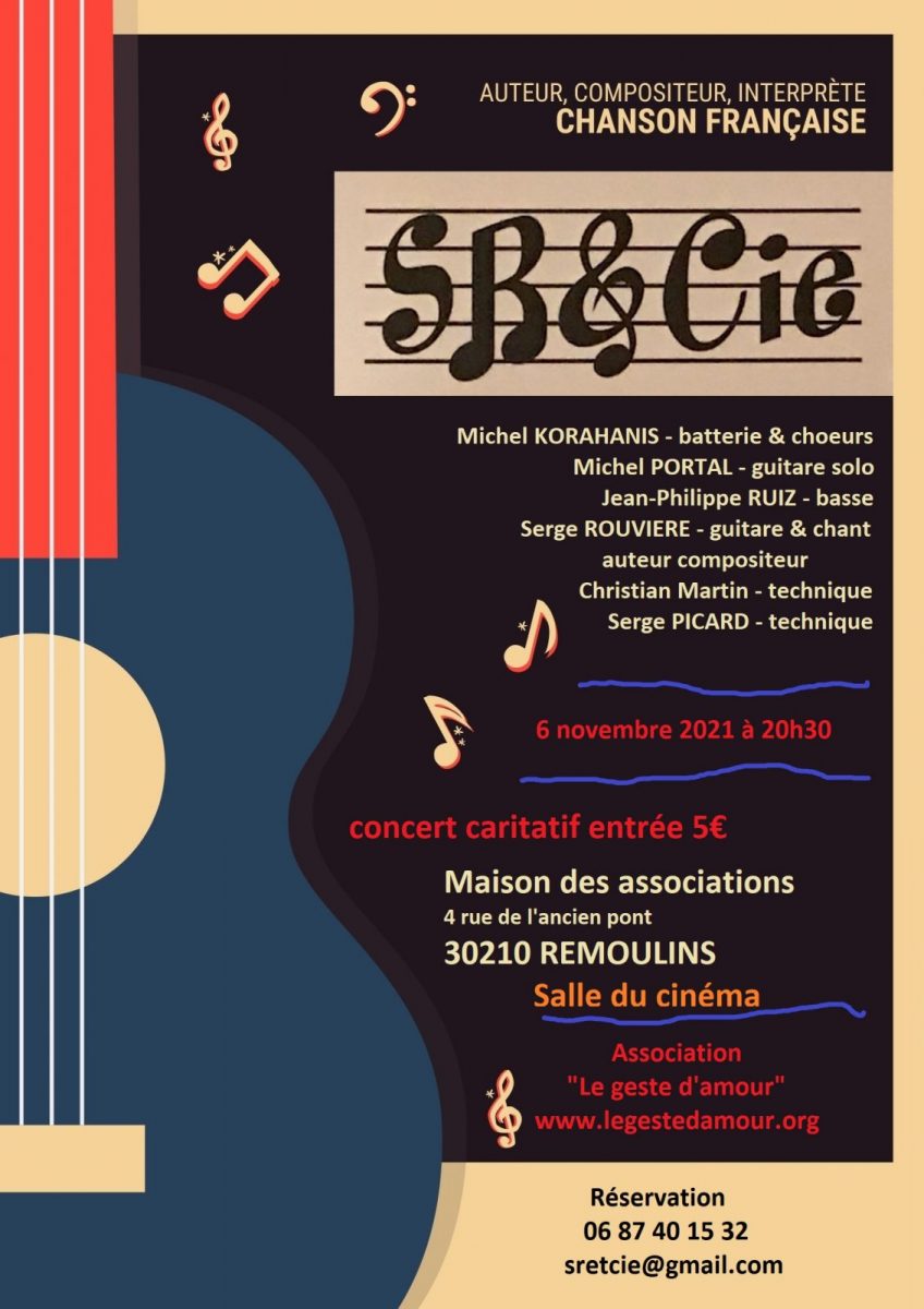 Venez écouter en concert, le groupe SR&Cie. Il s'agit d'un concert caritatif pour l'association le Geste d'Amour. Les musiciens du groupe sont des auteurs, compositeurs de chansons françaises