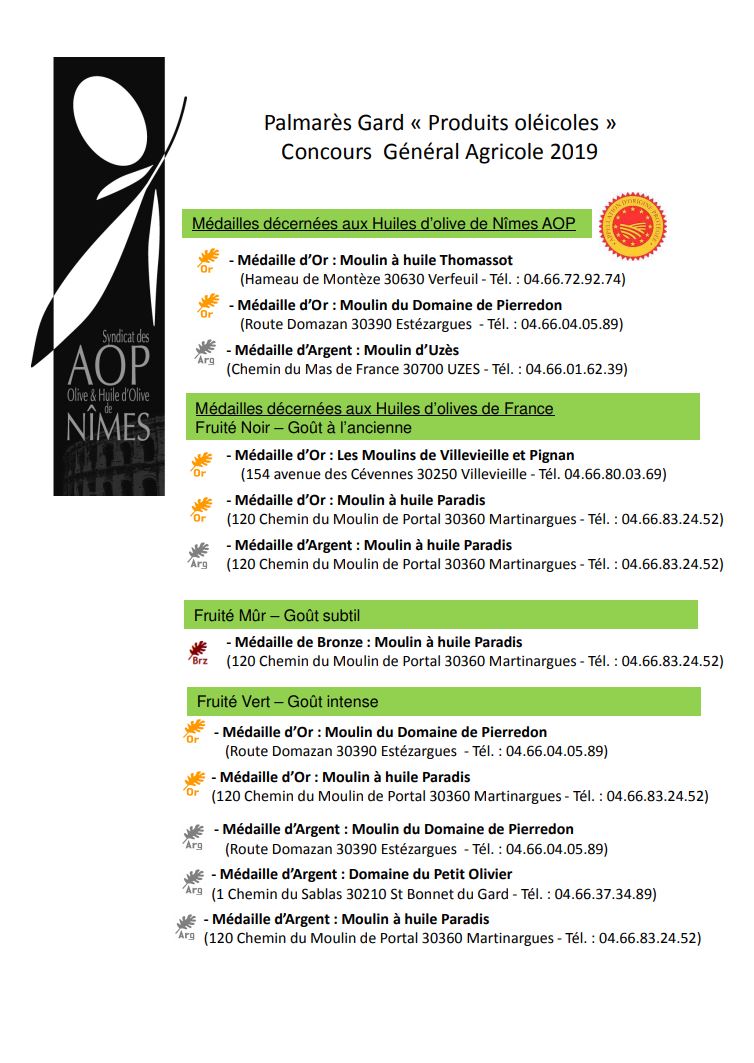 Le palmarès des Médaillés et Prix d'excellence au Concours Général Agricole 2019 pour les produits oléicoles gardois a été dévoilé il y a quelques jours.