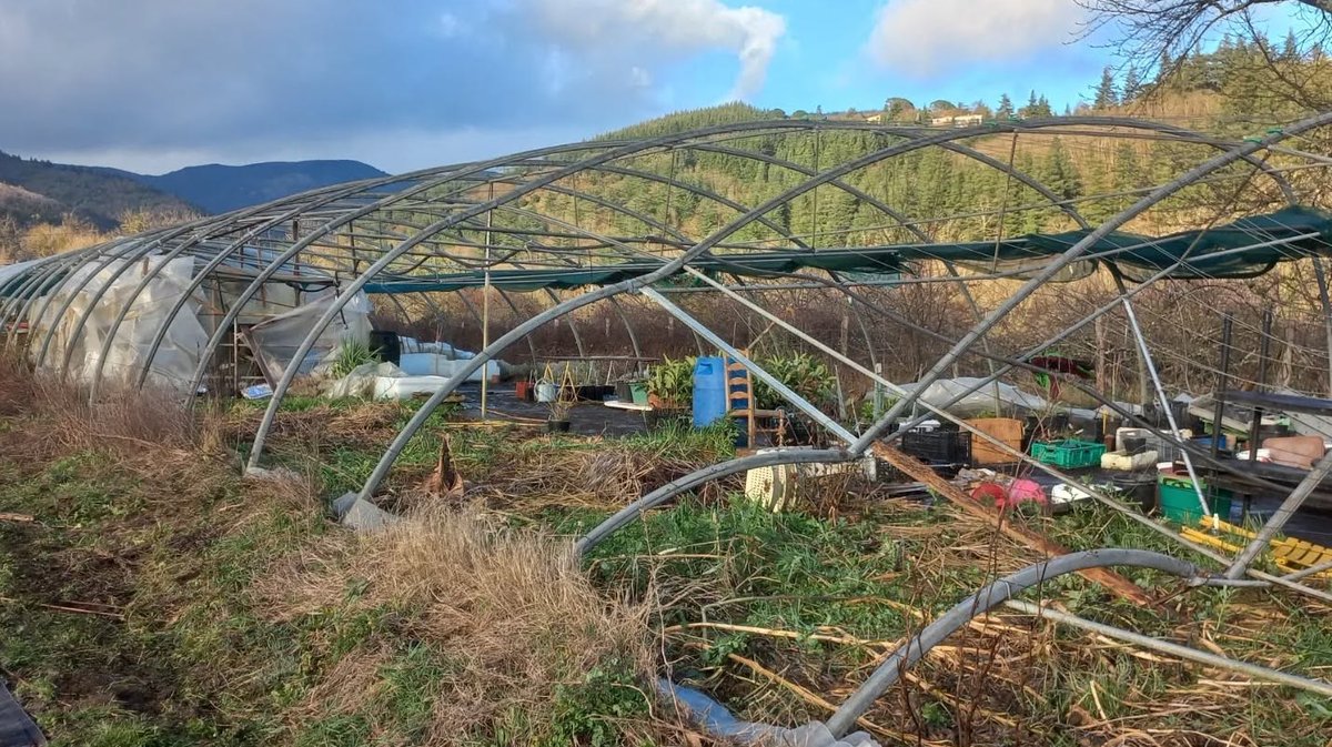 "La première zone, avec le brise-vent que j'avais fait, a explosé. Puis, la structure en bois." Et, enfin, la serre. Et parmi les végétaux mis sous serre, "pas mal de trucs ont souffert. J'avais fait une serre dans la serre pour la chaleur, pour y mettre des boutures et des essences fragiles. Et ça fait plusieurs jours qu'elles sont à l'air libre."