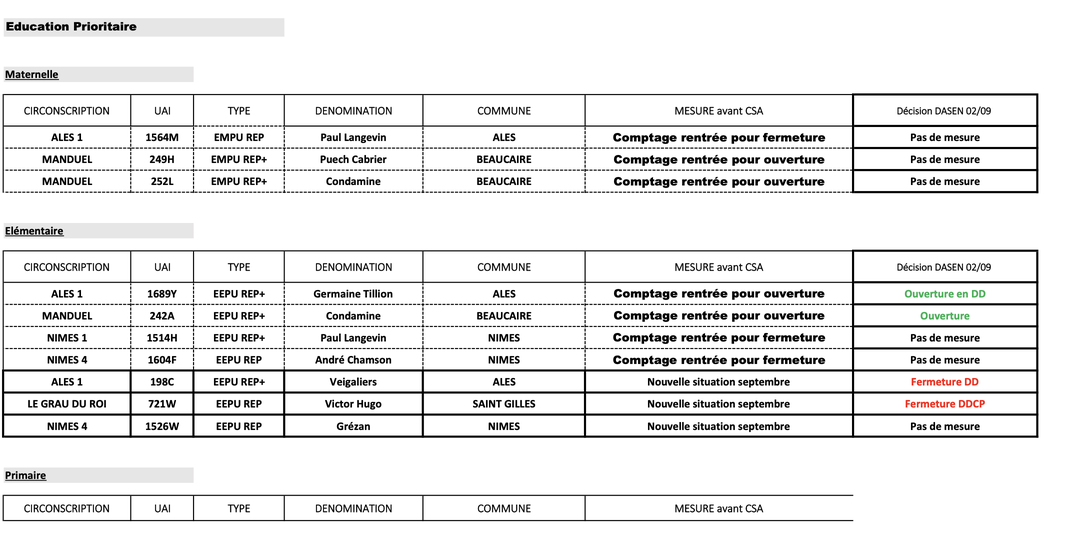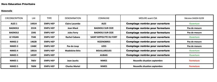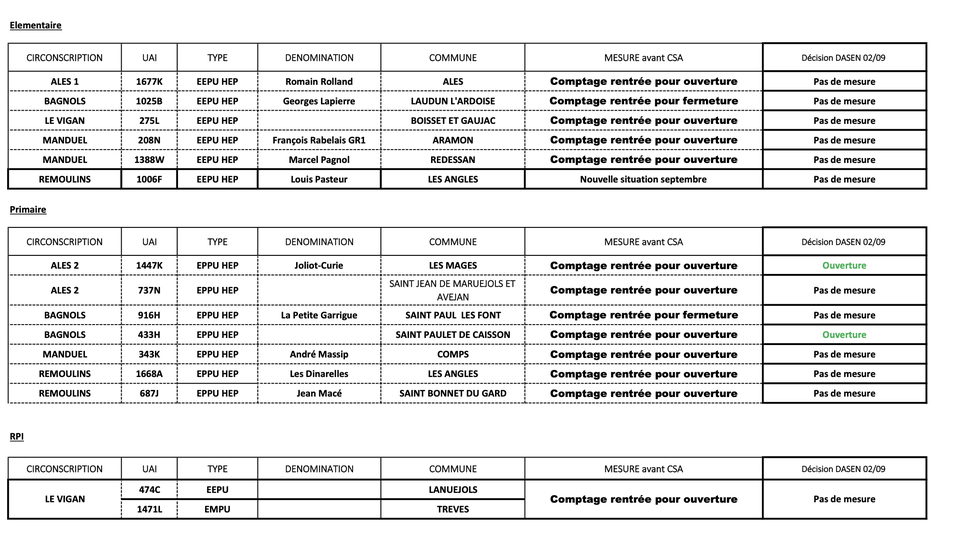 Comme à chaque rentrée, les services de l'Éducation nationale du Gard procèdent à des ajustements de la carte scolaire pour le 1ᵉʳ degré. Voici les décisions de Christophe Mauny, le Dasen du Gard (cliquez sur l'image pour voir plus grand) :