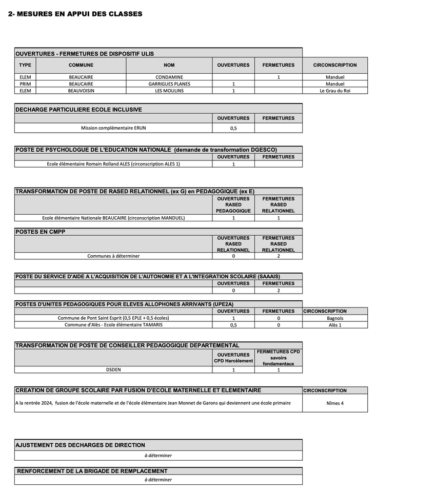 Comme le laisse entendre la DSDEN dans son communiqué, et la tradition que souligne la FSU, des ajustements de cette carte scolaire restent possibles en juin et septembre prochains, en fonction des apports de population ou de fins de construction dans certains villages. En attendant, la liste des ouvertures et fermetures envisagées à la rentrée 2024 est à retrouver ci-après (cliquez sur les images pour voir en grand) :