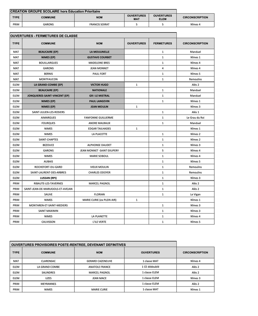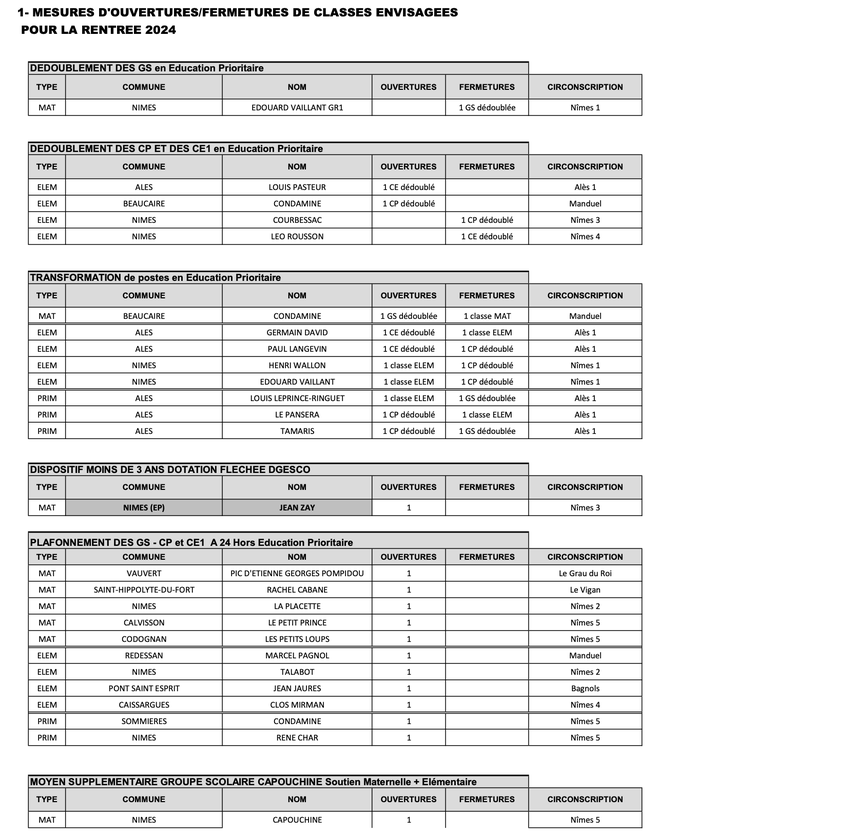 La syndicaliste signale aussi le cas particulier de Garons, où des fermetures de classe interviennent à l'école Jean-Monnet, où maternelle et élémentaire fusionnent dans une seule école primaire, alors que s'ouvrira la nouvelle école Francis-Soirat. D'où un mouvement de balancier qui voit l'ouverture de dix classes dans la nouvelle structure (cinq en maternelle et cinq en élémentaire) et la fermeture de neuf autres à Jean-Monnet.
