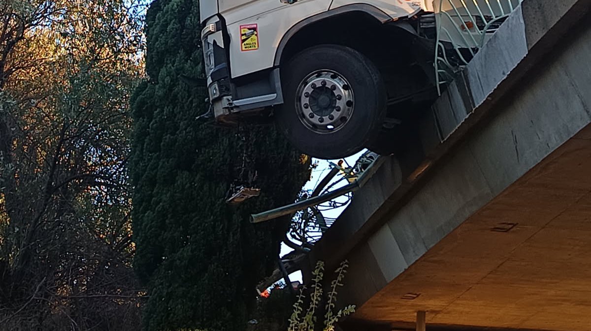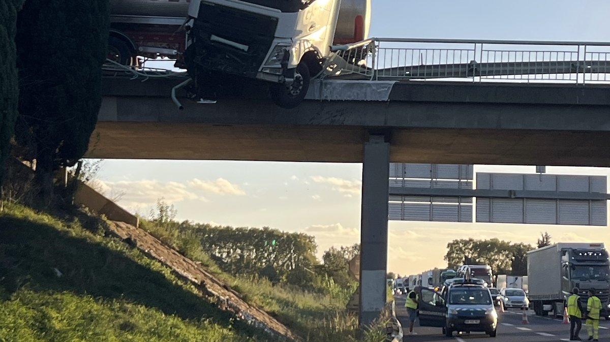 Alors qu'il conduisait dans le sens Montpellier-Avignon, un chauffeur poids lourd a décidé de sortir de l'autoroute au niveau de Nîmes. C'est en empruntant la sortie Nîmes-Est et ébloui par le soleil, selon les premiers éléments recueillis sur place, que ce dernier s'est retrouvé dans le vide. Au-dessus de l'autoroute A9, après avoir frotté la glissière de sécurité.