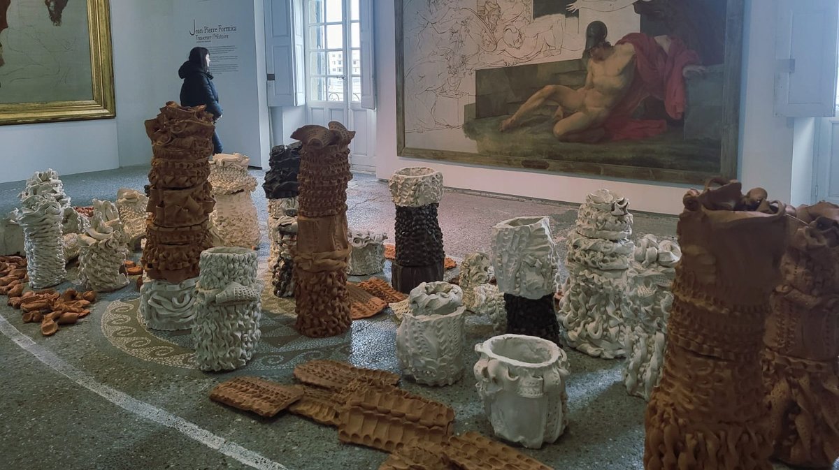 Dans cette quête de l’écho contemporain, Jean-Pierre Formica compte parmi les artistes invités. Et a ainsi investi ce qui fut l’atelier de Jacques Réattu. Face à une précieuse tapisserie du XVIᵉ siècle, appartenant aux Chevaliers de l’Ordre de Malte, et aux toiles inachevées de Jacques Réattu et François-Xavier Fabre, Andy Neyrotti souhaitait faire intervenir "un artiste avec une sensibilité au feuilletage historique", à cette idée de couches successives. Formica était presque une évidence. Avec son installation au sol, qui rappelle celle d’un chaland à la cargaison déchargée par le Rhône, l’artiste propose ici une archéologie contemporaine, "archipel de fragments sur le flux du temps".