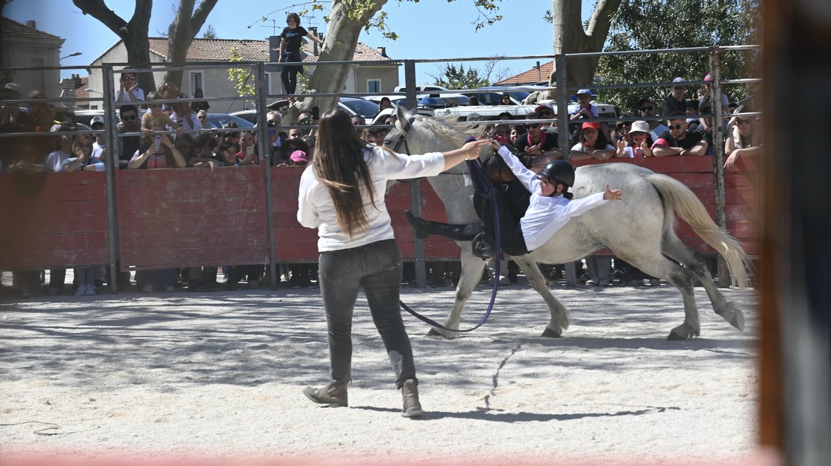 Une note plus légère cette fois-ci, en début d'après-midi, du côté des arènes portatives, place de la Croisière, avec une jolie démonstration de voltige équestre, suivie de la capea de l'école taurine du Pays d'Arles. Pendant ce temps, les peñas poursuivaient leur tour de ville, les concerts aux sonorités gitanes animaient bars et restaurants, et les sonos rythmaient l’heure de l’apéritif (encore)* ou du déjeuner. Sur le sable, Elian, Noa et Lenny, eux, affrontaient les becerros de la manade Valat. Et c'est le troisième, élève de l'école taurine de Nîmes, qui a remporté le trophée Souvenir Francis Espejo.