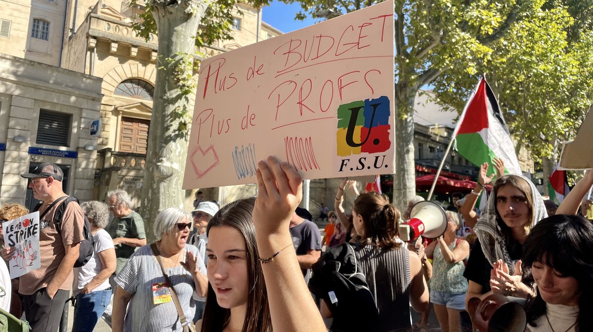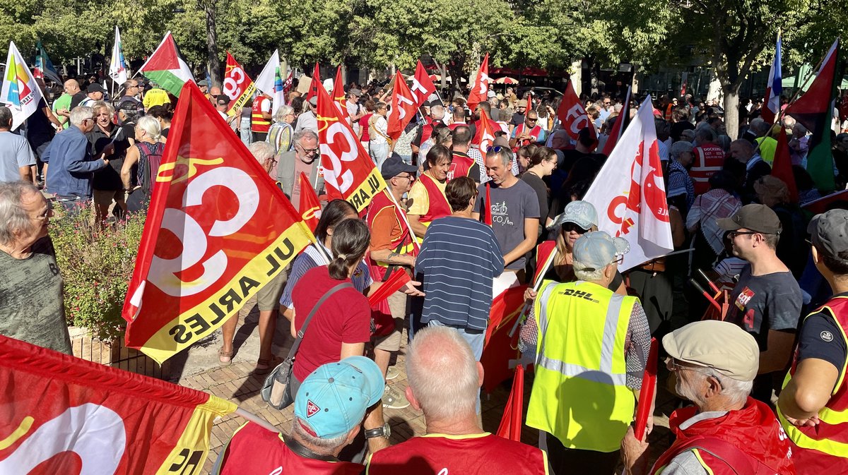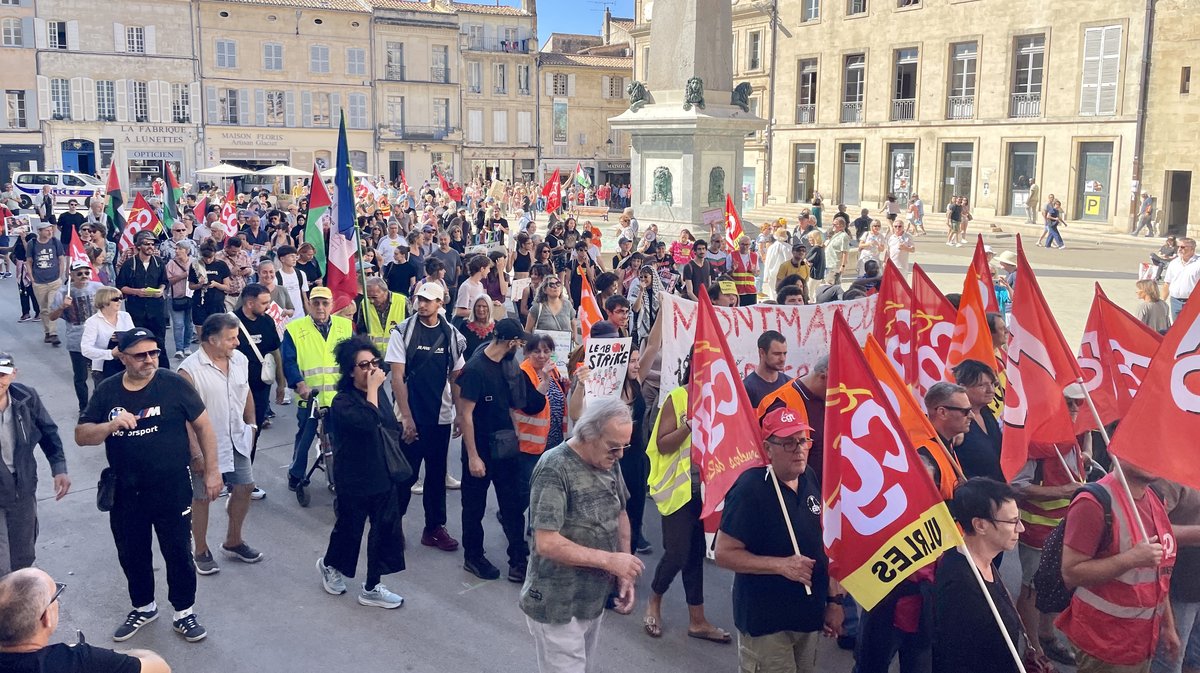 "Les sacrifices pour le monde du travail, ça suffit !" Huit organisations syndicales avaient appelé à la grève et à la manifestation ce jeudi 18 septembre à Arles. Le rendez-vous était donné dès 10h30 devant le kiosque à musique, sur l'esplanade Charles-de-Gaulle. "Nous voulons des moyens budgétaires à la hauteur des missions des services et des politiques publiques, des mesures pour lutter contre la précarité et renforcer la solidarité, des investissements dans une transition écologique juste et de la réindustrialisation de la France et des mesures contre les licenciements, la justice sociale [...], une protection sociale de haut niveau et l'abandon de la retraite à 64 ans", a déclaré Nicolas Bourcy, secrétaire général de l'UL CGT d'Arles, au nom de l'intersyndicale.