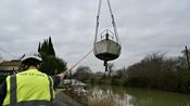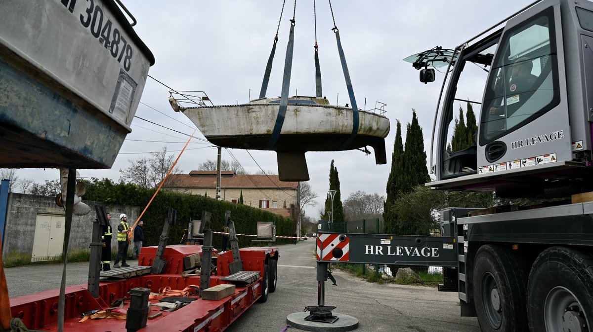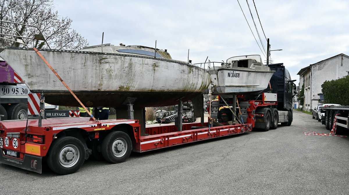 Les premières évacuations ont donc eu lieu ce mercredi. Trois épaves ont été sorties de l'eau, reliées par des sangles à une grue de 48 tonnes. Sur le plan technique, la vétusté de certaines coques complique les opérations. "Sur les unités les plus lourdes notamment, il faut positionner les sangles au niveau des cloisons de renfort", explique Cyril Charluet, responsable qualité, sécurité, environnement et santé au sein de HR Levage. À défaut, la structure fragilisée pourrait céder sous la contrainte du levage.