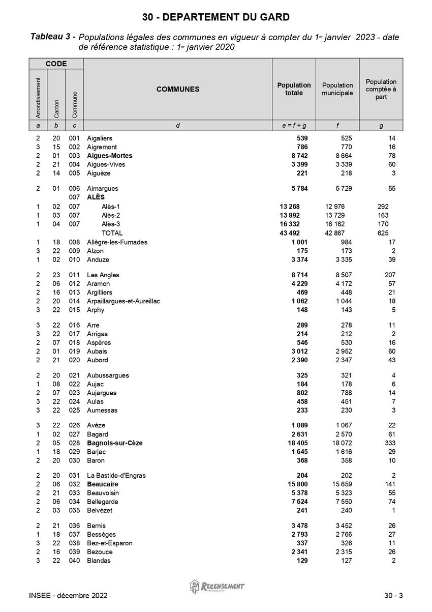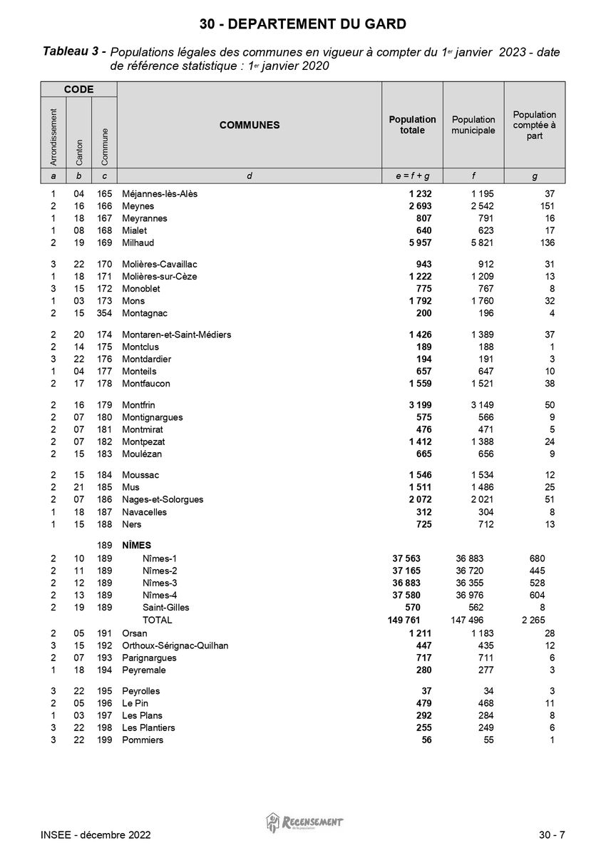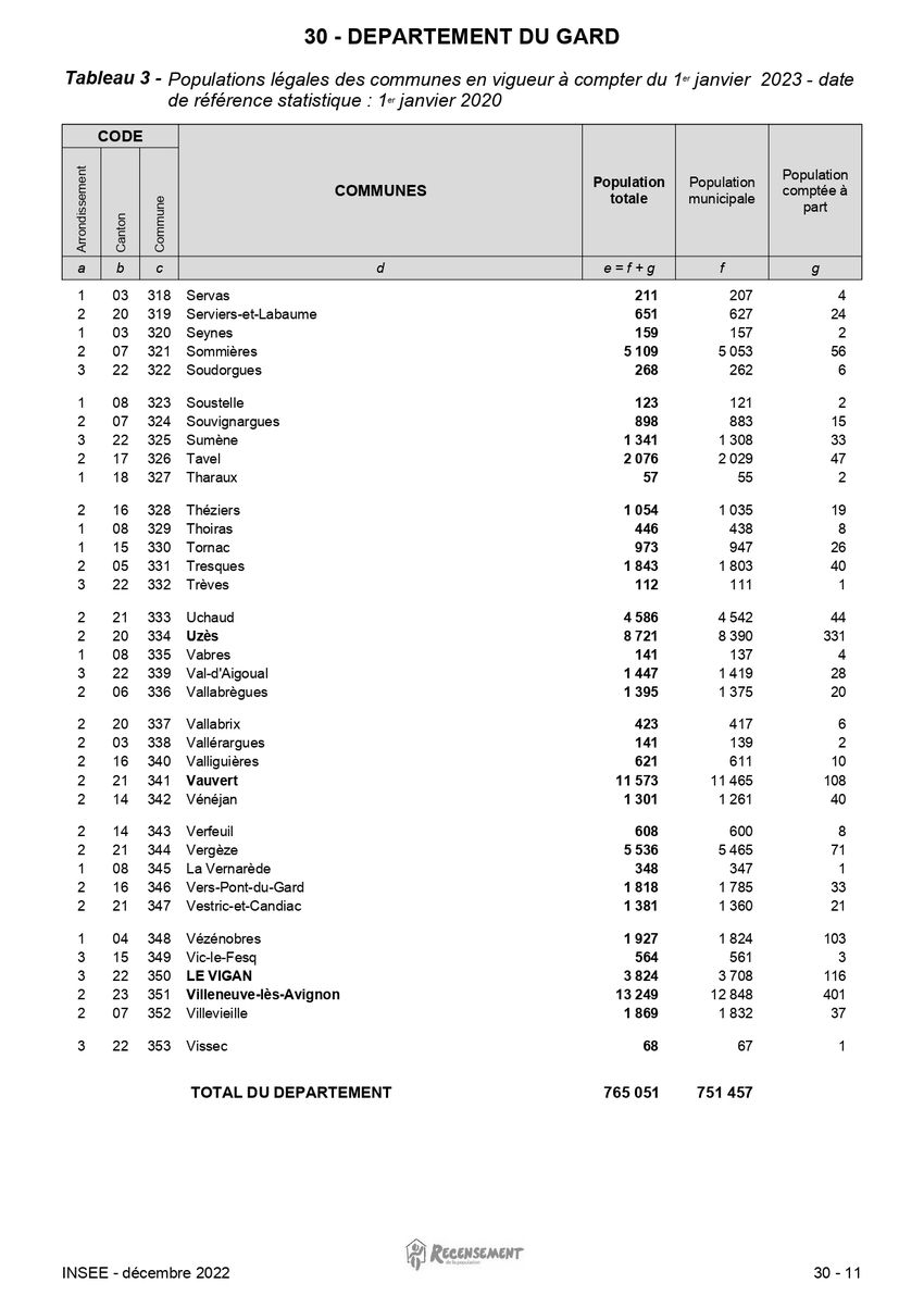 Pas de grand changement dans le top 10 des villes les plus peuplées. Nîmes compte 147 496 habitants, Alès 42 867 (la Ville des Cévennes enregistre une hausse moyenne de 1,2% par an de sa population entre 2014 et 2020, ndlr) et Bagnols-sur-Cèze 18 072. En 4e place, on retrouve Beaucaire avec 15 659 âmes suivie par Saint-Gilles (14 197 hab), Villeneuve-lez-Avignon (12 848 hab) (la cité cardinalice aussi voit sa population croître de 1,5% en moyenne par an entre 2014 et 2020, ndlr), Vauvert (11 465 hab) et Pont-Saint-Esprit (10 482 hab). On note un petit changement en queue de peloton : Aigues-Mortes avec ses 8 664 âmes passe devant Marguerittes qui est à 8 564.