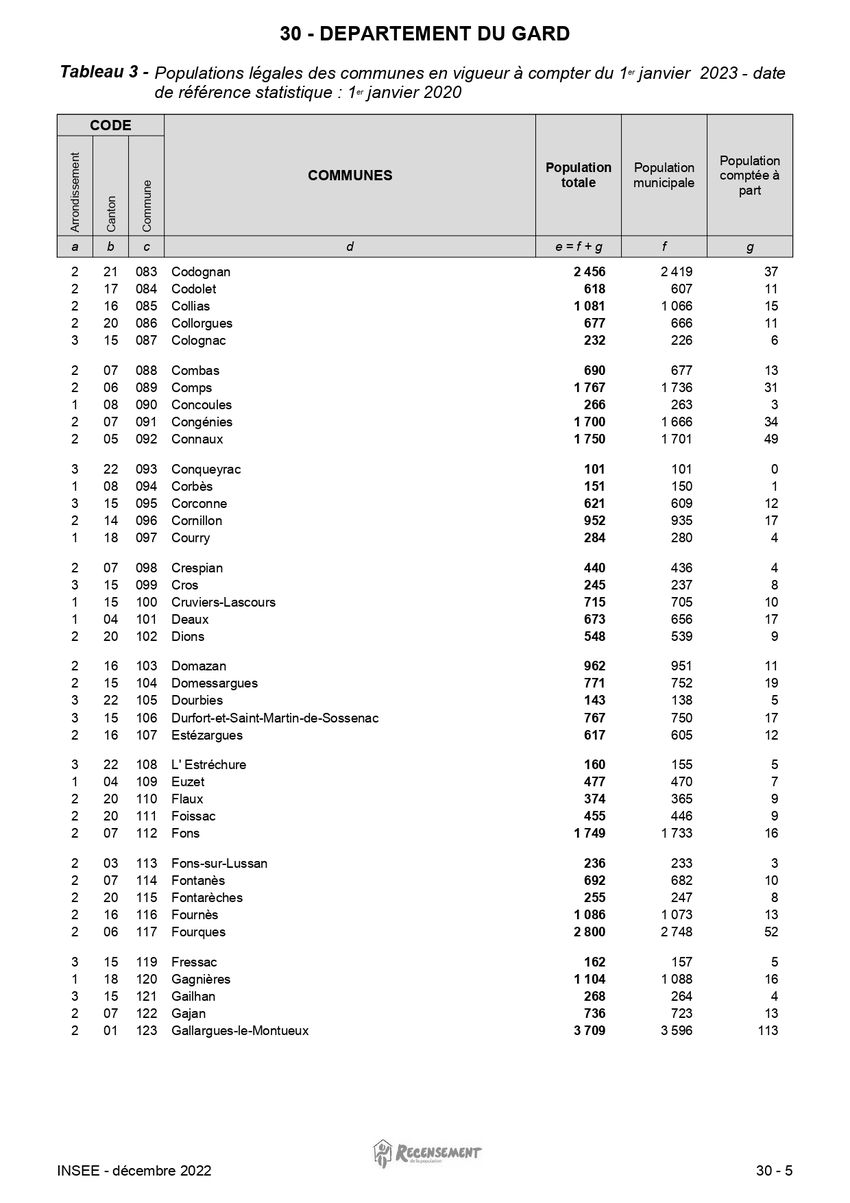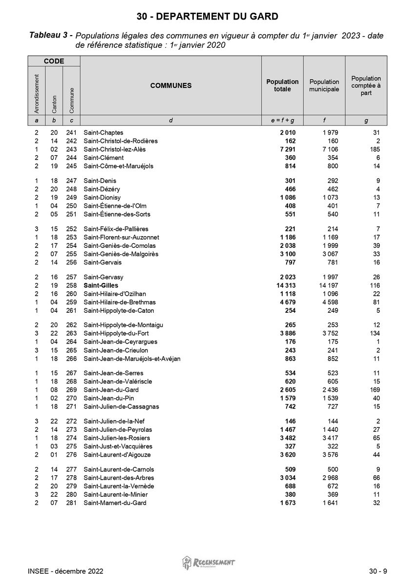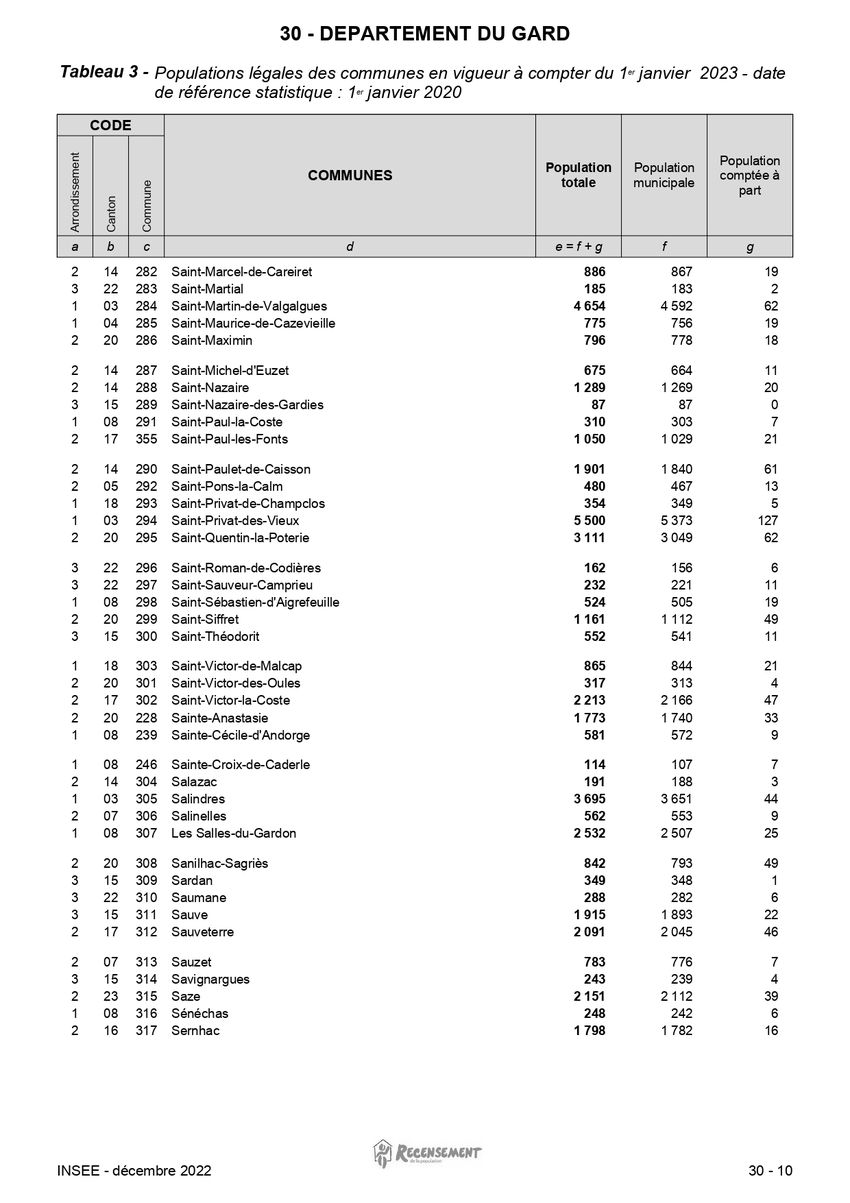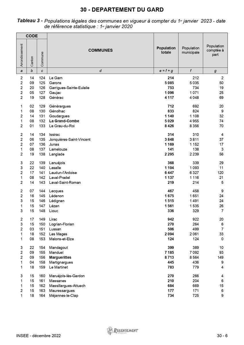 Pas de grand changement dans le top 10 des villes les plus peuplées. Nîmes compte 147 496 habitants, Alès 42 867 (la Ville des Cévennes enregistre une hausse moyenne de 1,2% par an de sa population entre 2014 et 2020, ndlr) et Bagnols-sur-Cèze 18 072. En 4e place, on retrouve Beaucaire avec 15 659 âmes suivie par Saint-Gilles (14 197 hab), Villeneuve-lez-Avignon (12 848 hab) (la cité cardinalice aussi voit sa population croître de 1,5% en moyenne par an entre 2014 et 2020, ndlr), Vauvert (11 465 hab) et Pont-Saint-Esprit (10 482 hab). On note un petit changement en queue de peloton : Aigues-Mortes avec ses 8 664 âmes passe devant Marguerittes qui est à 8 564.