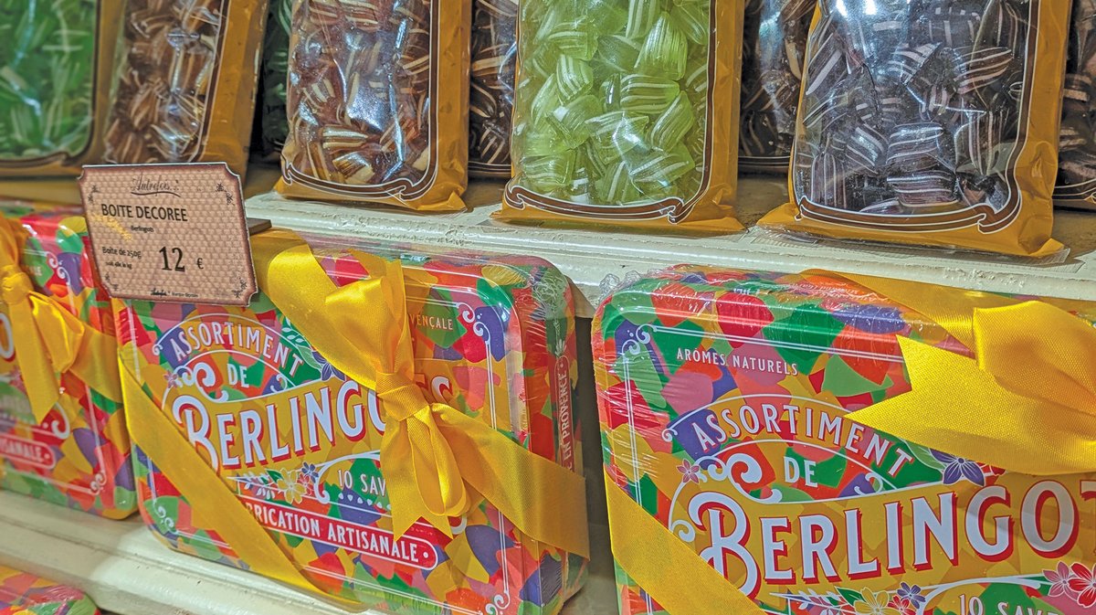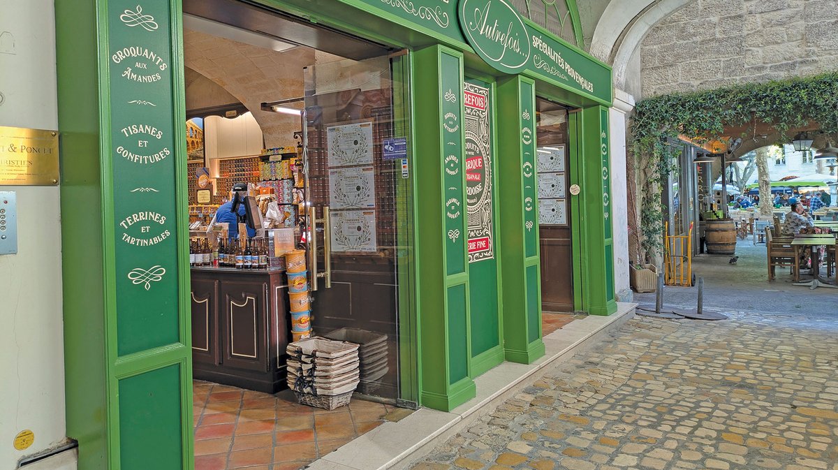 « Vous prendrez bien un petit biscuit ? Vous préférez à la fleur d’oranger ou à l'anis ? » La boutique Autrefois, cachée sous une arche de la place aux Herbes d’Uzès, juste à côté de la porte d’entrée d'une agence immobilière de luxe, est élégante. À l’intérieur, on remonte le temps. Navettes, pots de confiture, boîtes en fer blanc sont soigneusement disposés. Tout au fond, des berlingots dorés, framboise ou encore vert menthe étalent leurs couleurs. Chacune des petites pyramides est striée de fins traits de sucre blanc. Sur un écran plat, on voit une main qui découpe aux ciseaux un tube de berlingot. Une affiche invite à visiter la fabrique.