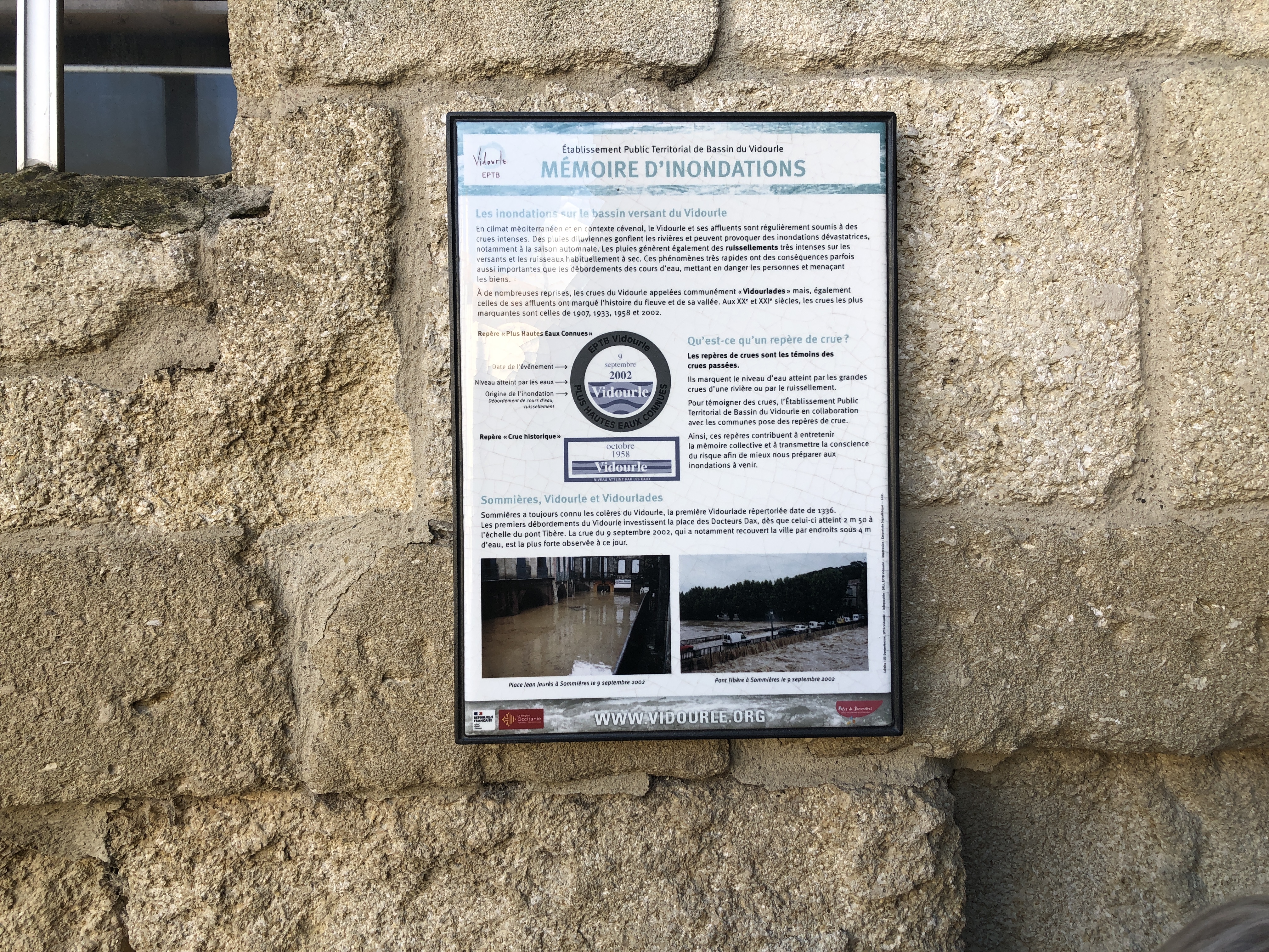Après une première mise en place dans le cadre du PAPI (Programmes d'actions de prévention des inondations) Vidourle I, l’opération du PAPI Vidourle II prévoit de densifier les sites de pose de repères avec 40 macarons PHEC (Plus hautes eaux connues), 13 plaques rectangulaires « crue historique », 17 panneaux d’information qui seront répartis sur 28 communes du bassin versant, dont la moitié équipée pour le première fois. Quelques repères abîmés ou arrachés ont également été restaurés.